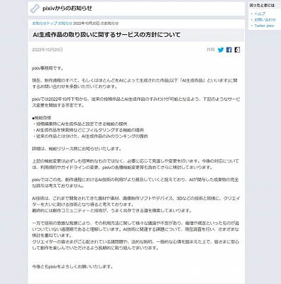 픽시브, 인공지능 생성 일러스트의 취급에 대해 앞으로의 방침을 발표