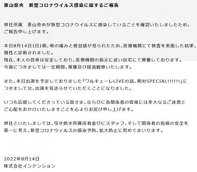 성우 토우야마 나오, 신종 코로나 바이러스 양성 판정