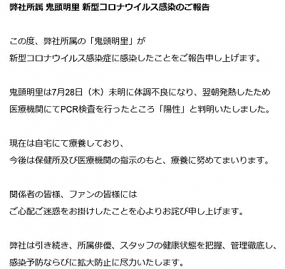 성우 아오키 시키, 코로나 양성 판정을 받았답니다