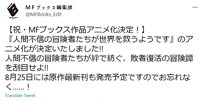 라이트노벨 '인간 불신 모험가들이 세계를 구하는 듯합니다' 애니메이션화 결정