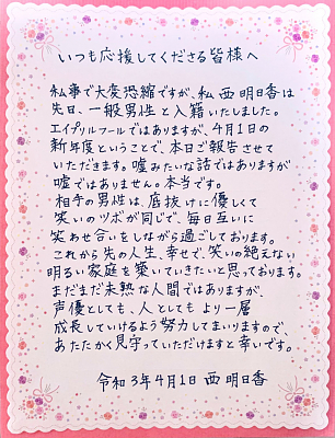 성우 니시 아스카, 일반 남성과 결혼했음을 발표