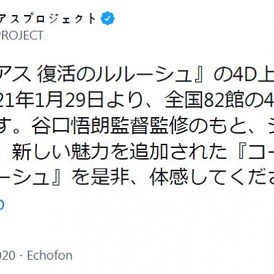 애니메이션 '코드기어스 부활의 루루슈'의 4D 상영이 결정되었다고 합니다.