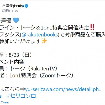 성우 세리자와 유우의 온라인 토크 & 1on1 특전회가 2020년 8월 23일에 개최될 예정