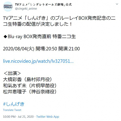 아이돌마스터 신데렐라 걸즈 극장 블루레이 박스 발매 직전 온라인 방송 소식