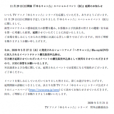 TV 애니메이션 '유루캠프' 스페셜 이벤트 개최 연기 발표