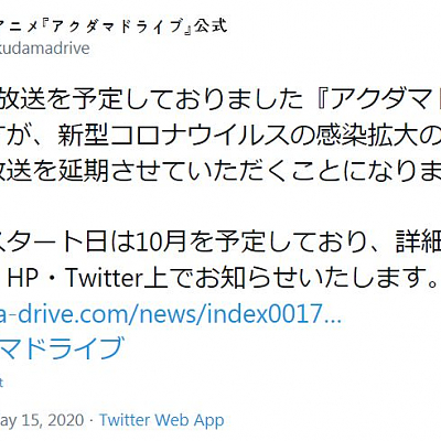 TV 애니메이션 '아쿠다마 드라이브'의 방송 개시 시기가 2020년 10월로 연기