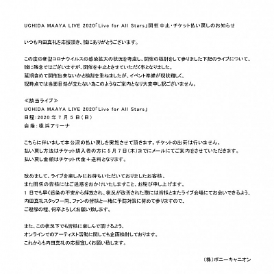 2020년 7월 5일에 개최될 예정이었던, 성우 우치다 마아야의 라이브 공연 중지 발표