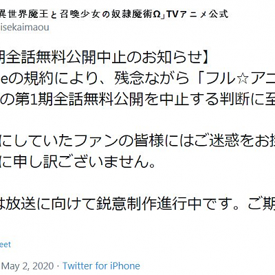 TV 애니메이션 '이세계마왕과 소환소녀의 노예마술' 유튜브 무료 공개 중지 발표