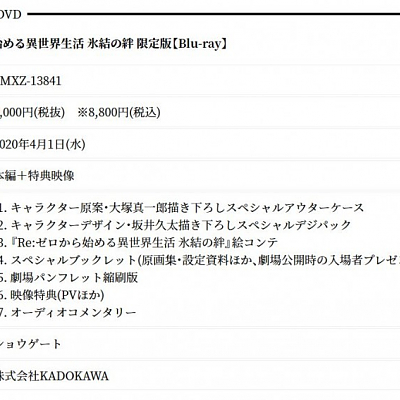 극장판 애니메이션 '리제로 빙결의 유대' 블루레이는 2020년 4월 1일 발매 예정