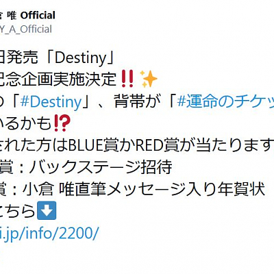 성우 오구라 유이의 10th 싱글 'Destiny' 구입자 대상 '운명의 티켓' 기획 실시