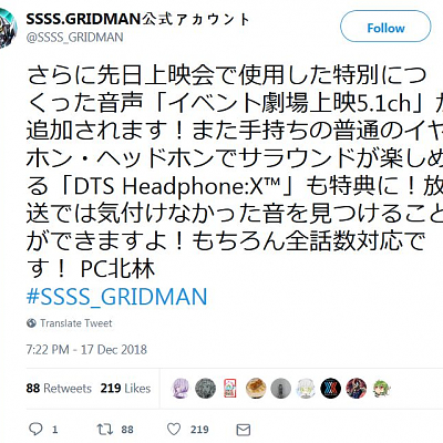 V 애니메이션 'SSSS.GRIDMAN'의 블루레이에 이벤트 한정 5.1ch 음성 수록 예정
