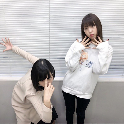 성우 사쿠라 아야네 & 오오니시 사오리의 사진, 이벤트 굿즈를 소개하는 모습