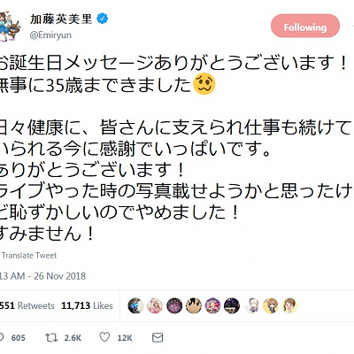성우 카토 에미리씨가 어느새 만 35세 생일을 맞이한 모양이로군요.