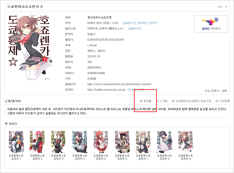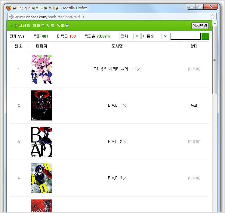 온나 독파율을 이용하여, 도서 재고를 관리하세요. 작성일시 : 2013. 01. 31 (21:37) 조회 : 1,381 라이트 노벨, 코믹에서 독파율을 클릭하면 독파율 리스트에 담아지며,로그인박스나 회원 닉네임을 클릭하면 독파율을 확인할 수 있습니다. 글쓰기스크랩 신고